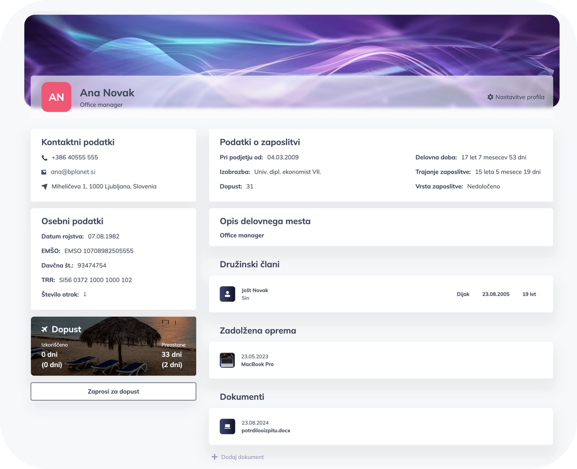 Omogoča enostavno upravljanje vseh kadrovskih procesov na enem mestu. Preprosto dostopajte do vseh ključnih podatkov o zaposlenih in optimizirajte kadrovske vire za doseganje najboljših rezultatov.
